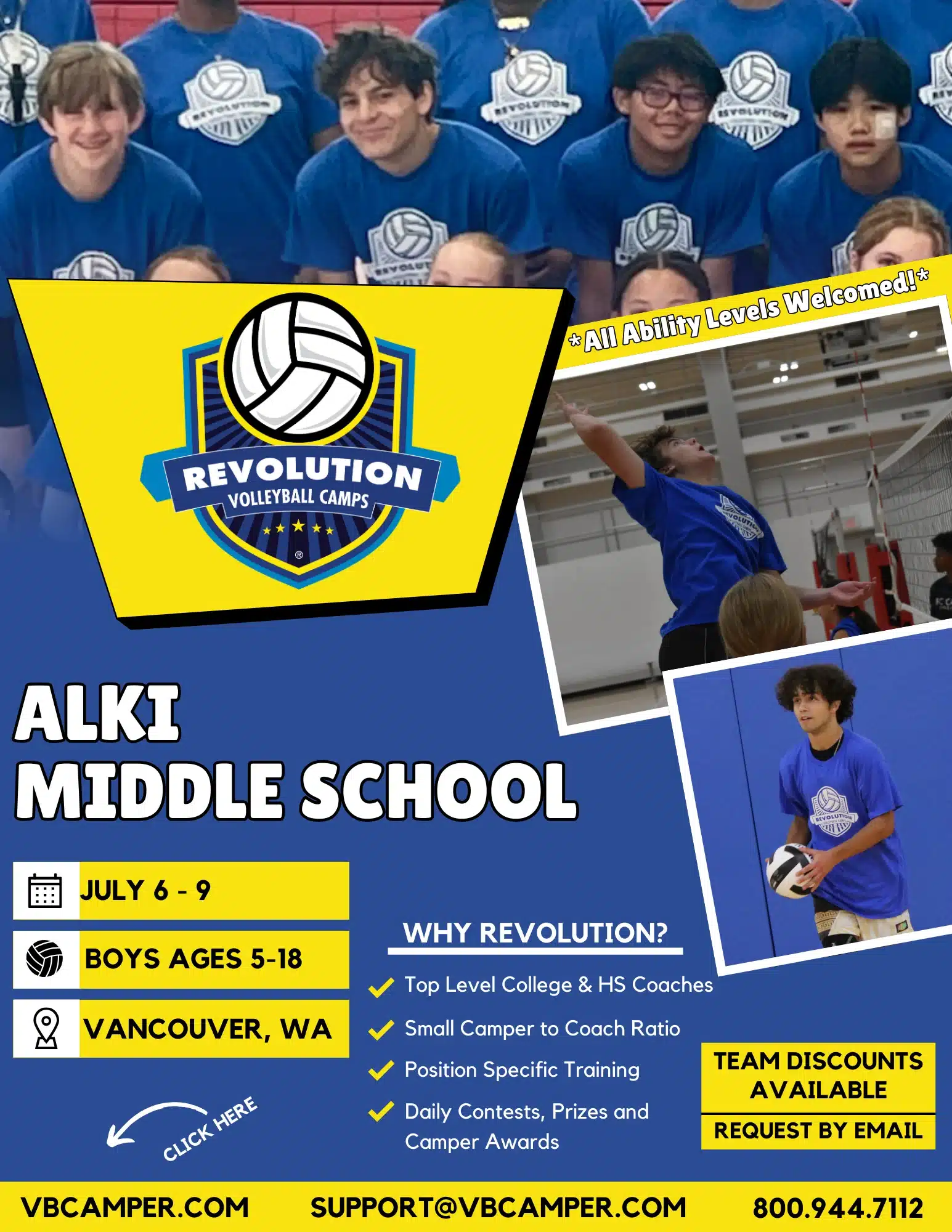 Alki Middle School features beautiful athletic facilities perfect for Volleyball and more. We’re excited to host the Revolution Volleyball Camps at Alki Middle School. Join us and improve your volleyball skills this summer!