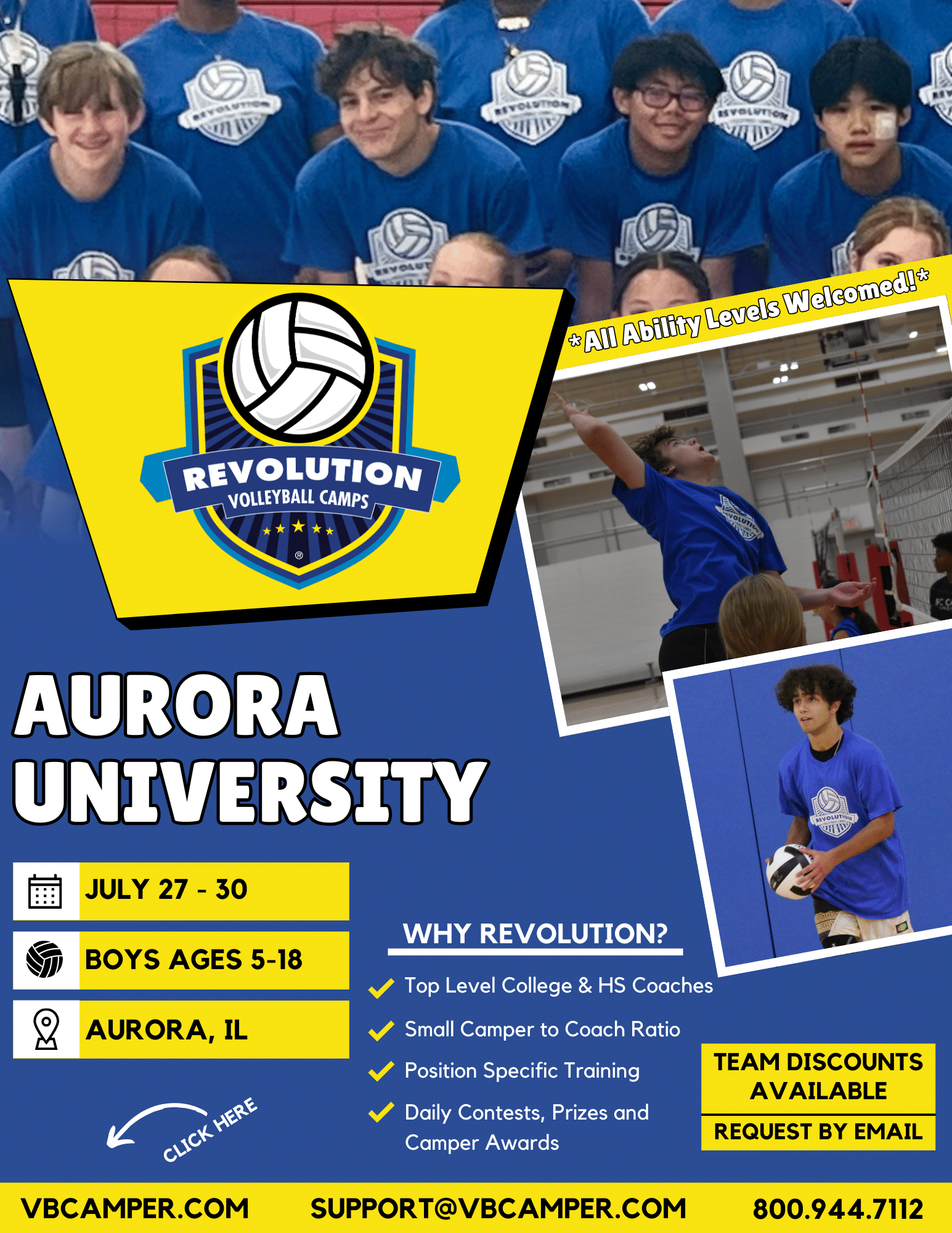We’re excited to host the Revolution Volleyball Camps at Aurora University in Aurora, IL. Join us and improve your volleyball skills this summer!