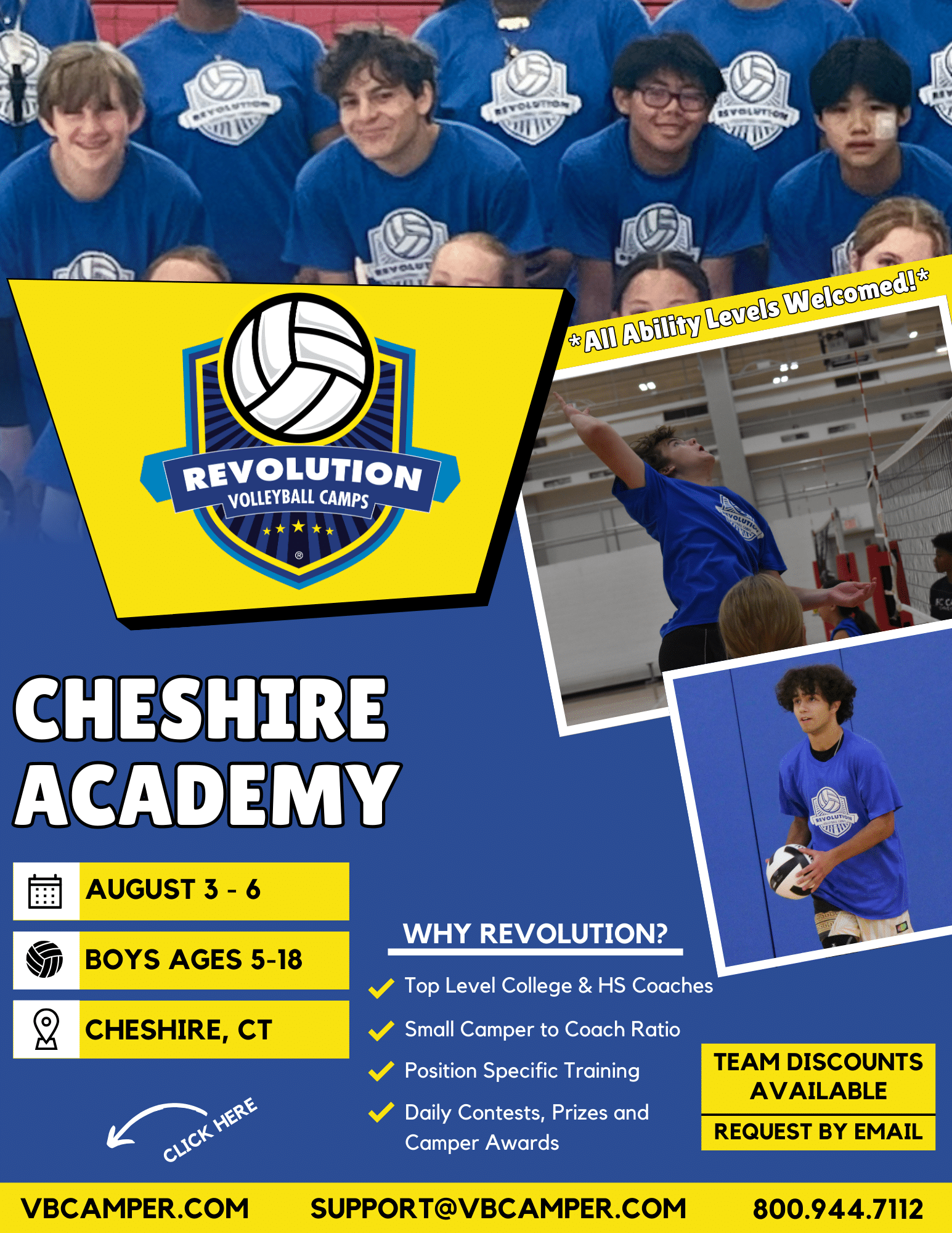 Located in central Connecticut and recognized as one of the best prep schools in New England, Cheshire Academy is a perfect spot to host an overnight Revolution Volleyball Camp. With top notch facilities both athletically, in the dorms, and dining services, join us this summer to improve your game, have fun with friends, and make new ones!