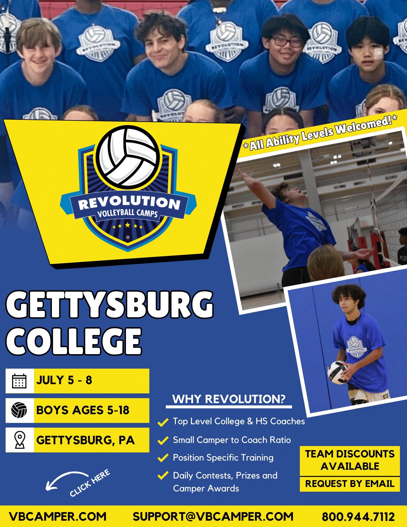 The Jaegar Athletic Center features 55,000 square feet of athletic, recreation, and fitness facilities. We’re excited to host the Revolution Volleyball Camps at Gettysburg College. Join us and have fun while improving your volleyball skills this summer!