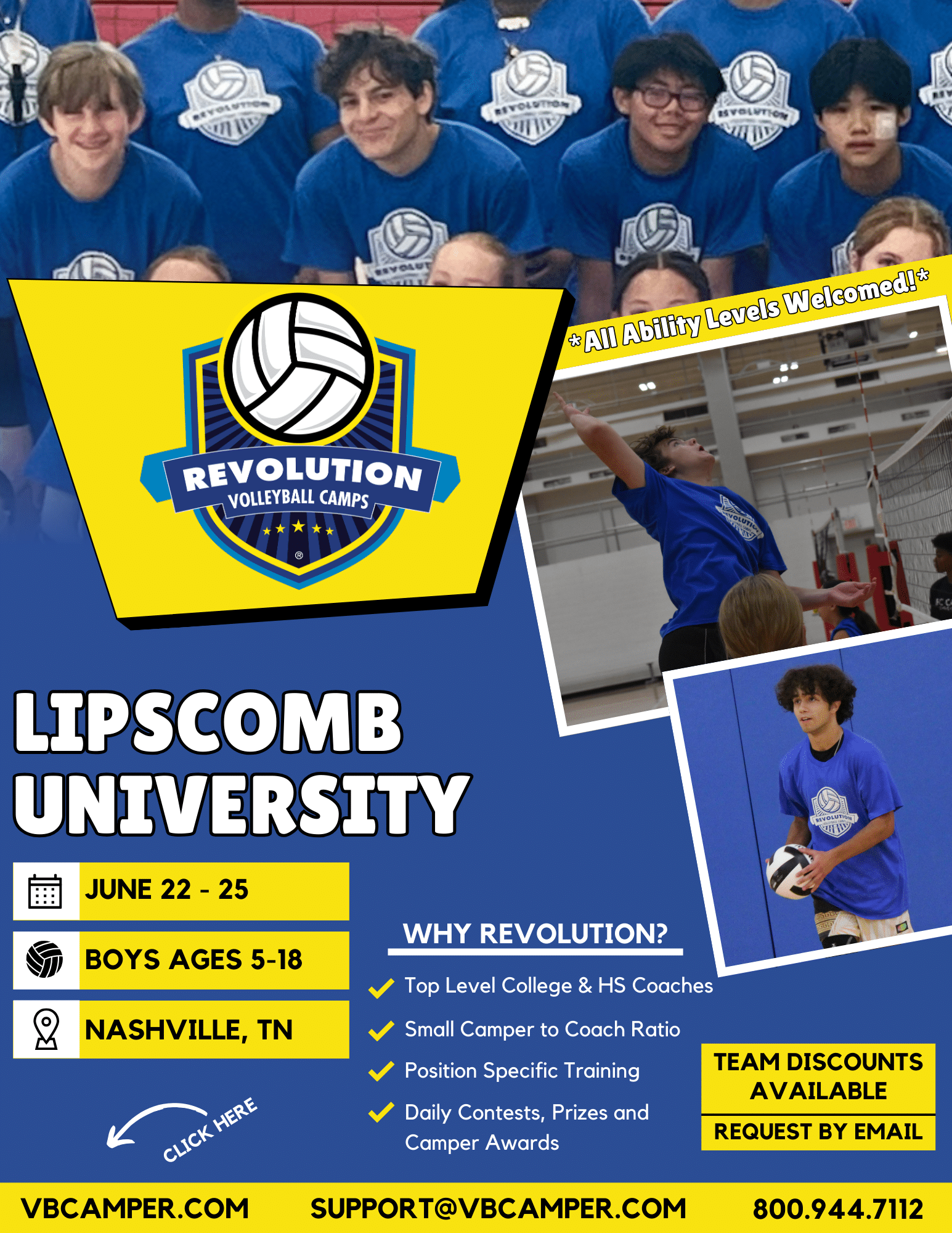 The Student Activities Center features more than 20,000 square feet of sports and exercise facilities for students, faculty, staff, and the community. We’re excited to host the Revolution Volleyball Camps at Lipscomb University. Join us and improve your volleyball skills this summer!