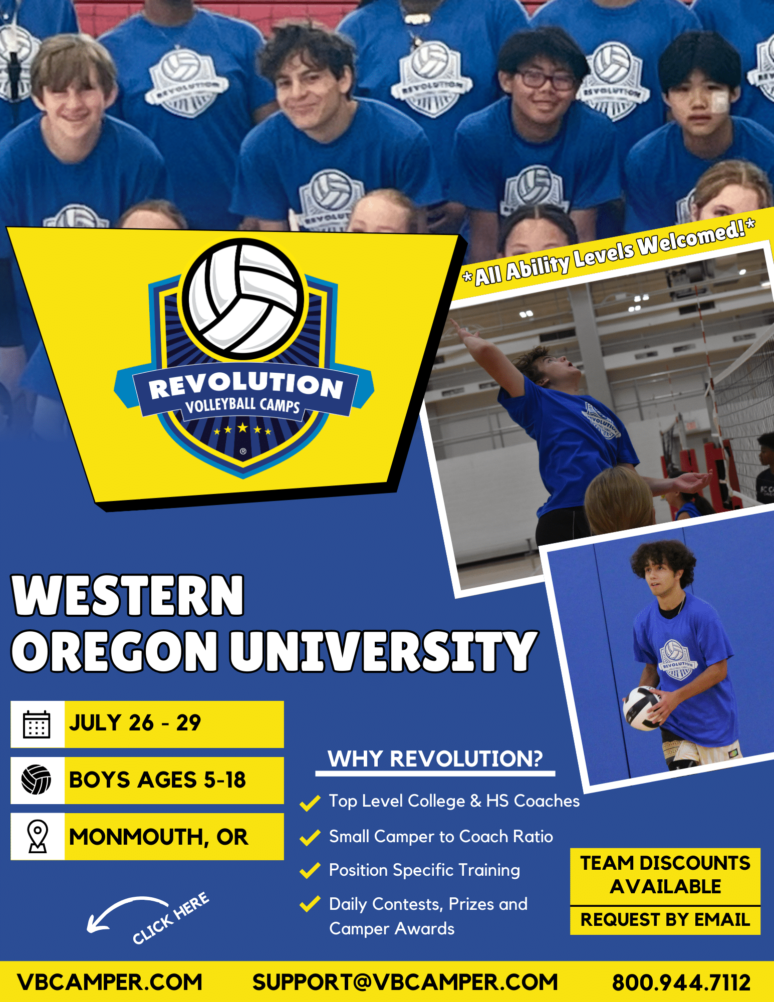 The Health and Wellness Center features a variety of athletic facilities and amenities that are used for Intramural Sports, fitness, and recreation. We’re excited to host the Revolution Volleyball Camps at Western Oregon University. Join us and have fun while improving your volleyball skills this summer!