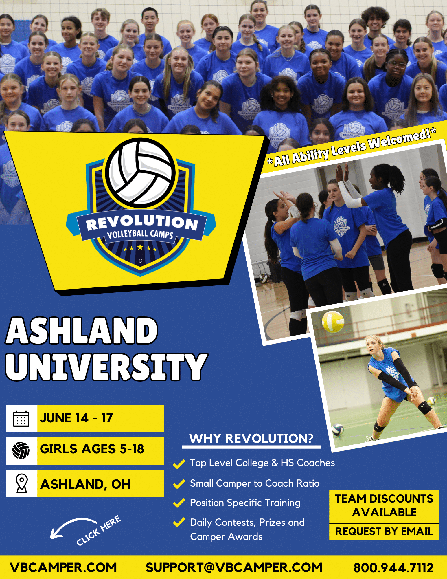 The Ashland University Rec Center features a variety of athletic facilities and amenities that are used for Intramural Sports, fitness, and recreation. We’re excited to host the Revolution Volleyball Camps at Ashland University. Join us and have fun while improving your volleyball skills this summer!