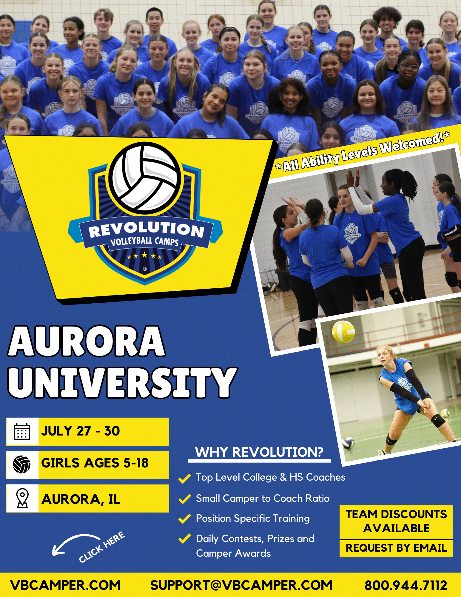 We’re excited to host the Revolution Volleyball Camps at Aurora University in Aurora, IL. Join us and improve your volleyball skills this summer!
