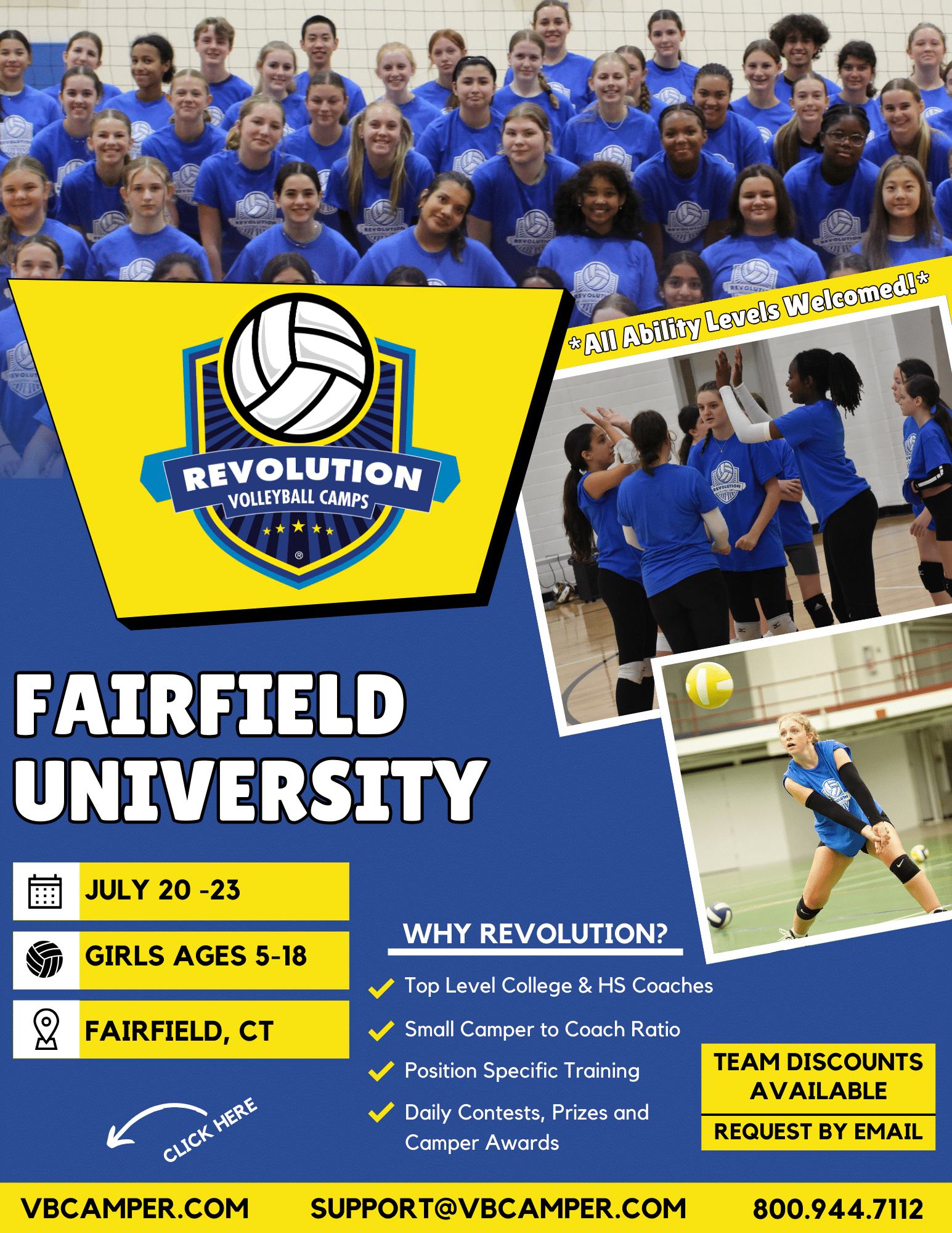 Located in the heart of Fairfield, CT, just in between I95 and the Merritt Parkway, Fairfield University is the ideal location to host a Revolution Volleyball Camp. Campers will get to participate at The Leo D. Mahoney Arena: a 85,000-square foot, 3,500-seat multi-use space recently completed in the center of the Fairfield University campus. It is the home of Fairfield Basketball and Volleyball in addition to serving as a venue for University events, and concerts. We’re excited to host the Revolution Volleyball Camps at Fairfield University. Join us and improve your volleyball skills this summer!