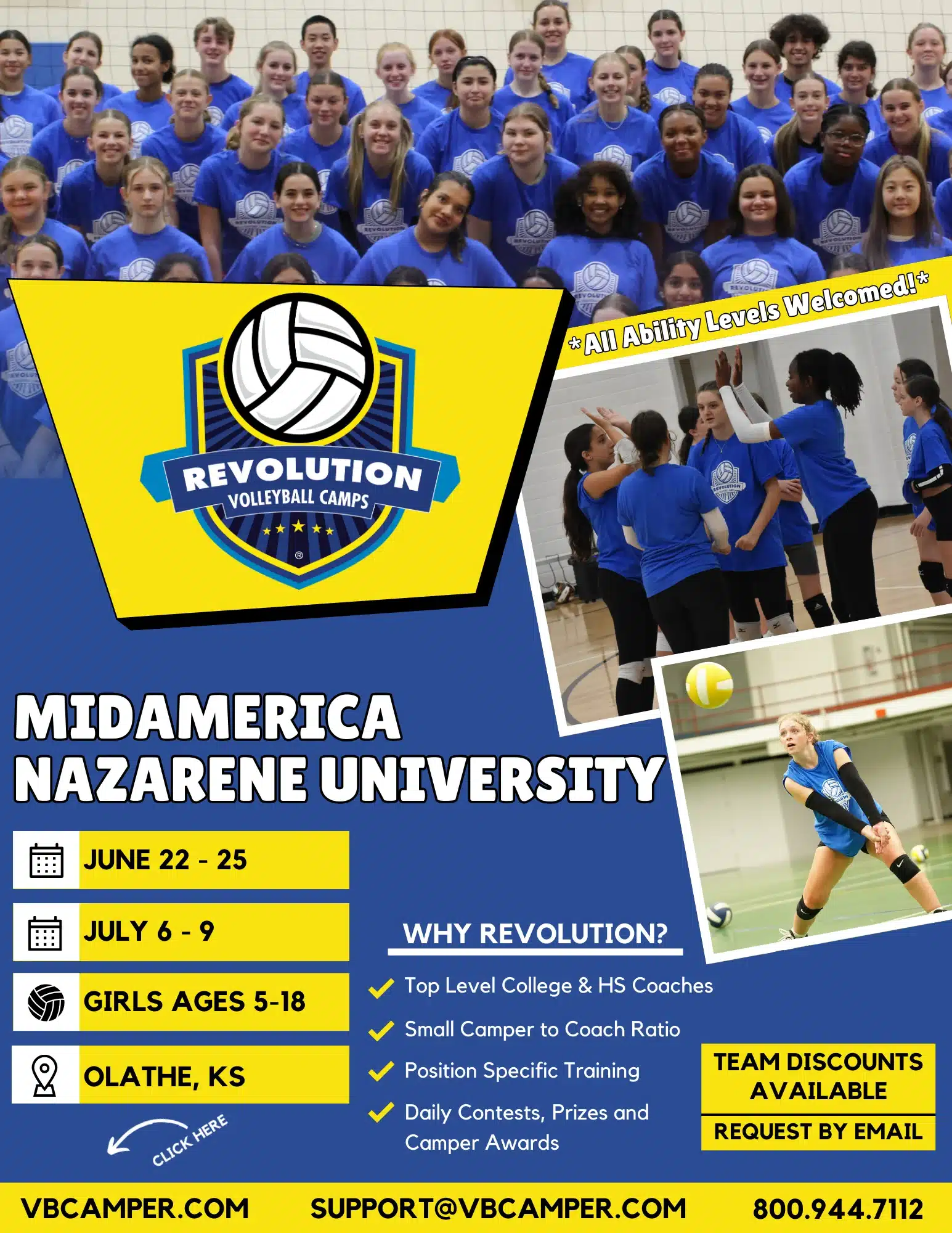 The Cook Center is home to the MidAmerica Nazerene Vollebyall team as well as other athletic programs and staff. We’re excited to host the Revolution Volleyball Camps at MidAmerica Nazarene University. Join us and have fun while improving your volleyball skills this summer!