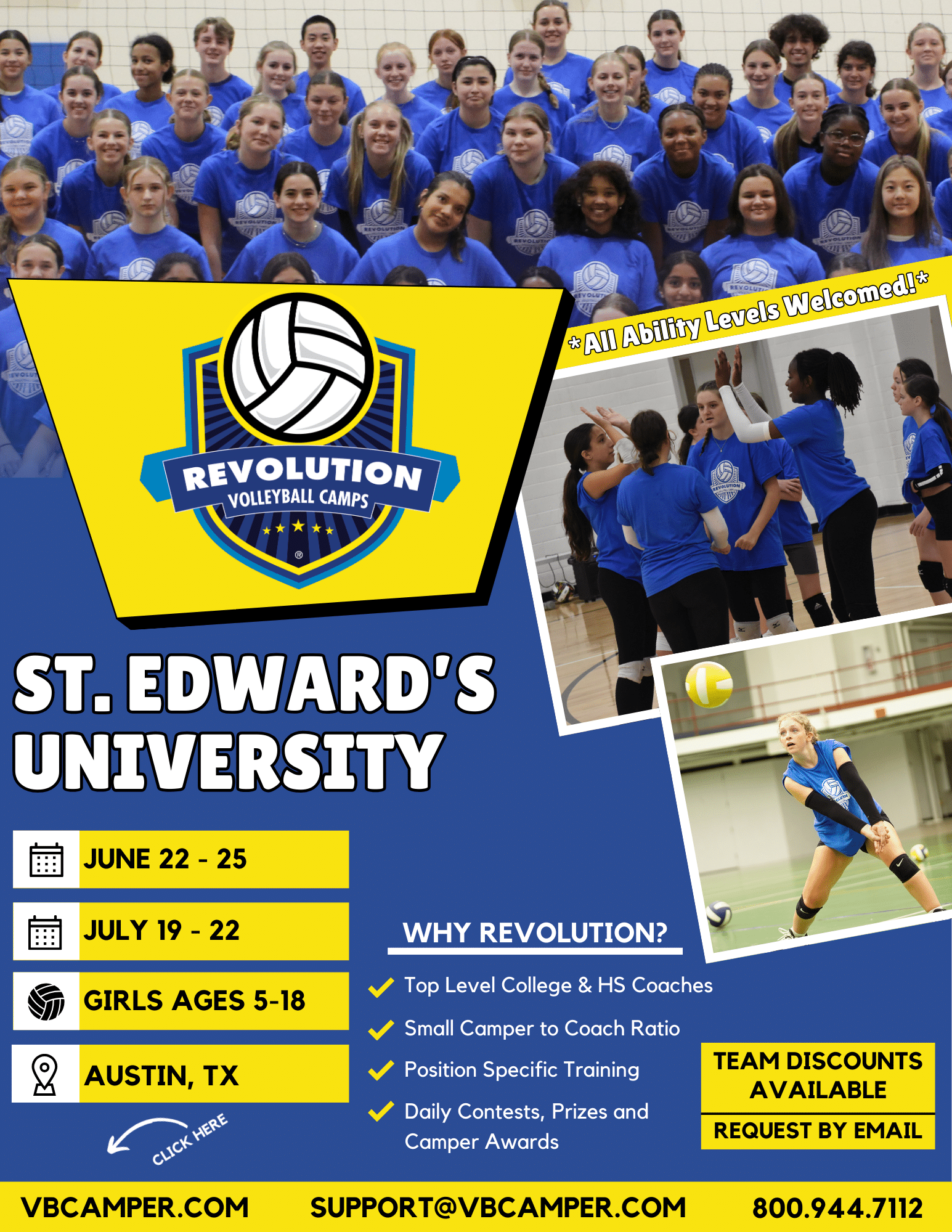 Revolution Volleyball Camp is open to kids & teens ages 5 to 18.