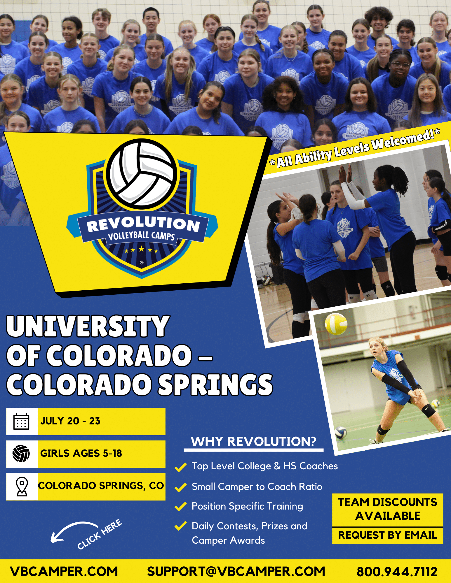 We’re excited to host the Revolution Volleyball Camps at The University of Colorado, Colorado Springs in Colorado Springs, CO. Join us and improve your volleyball skills this summer!