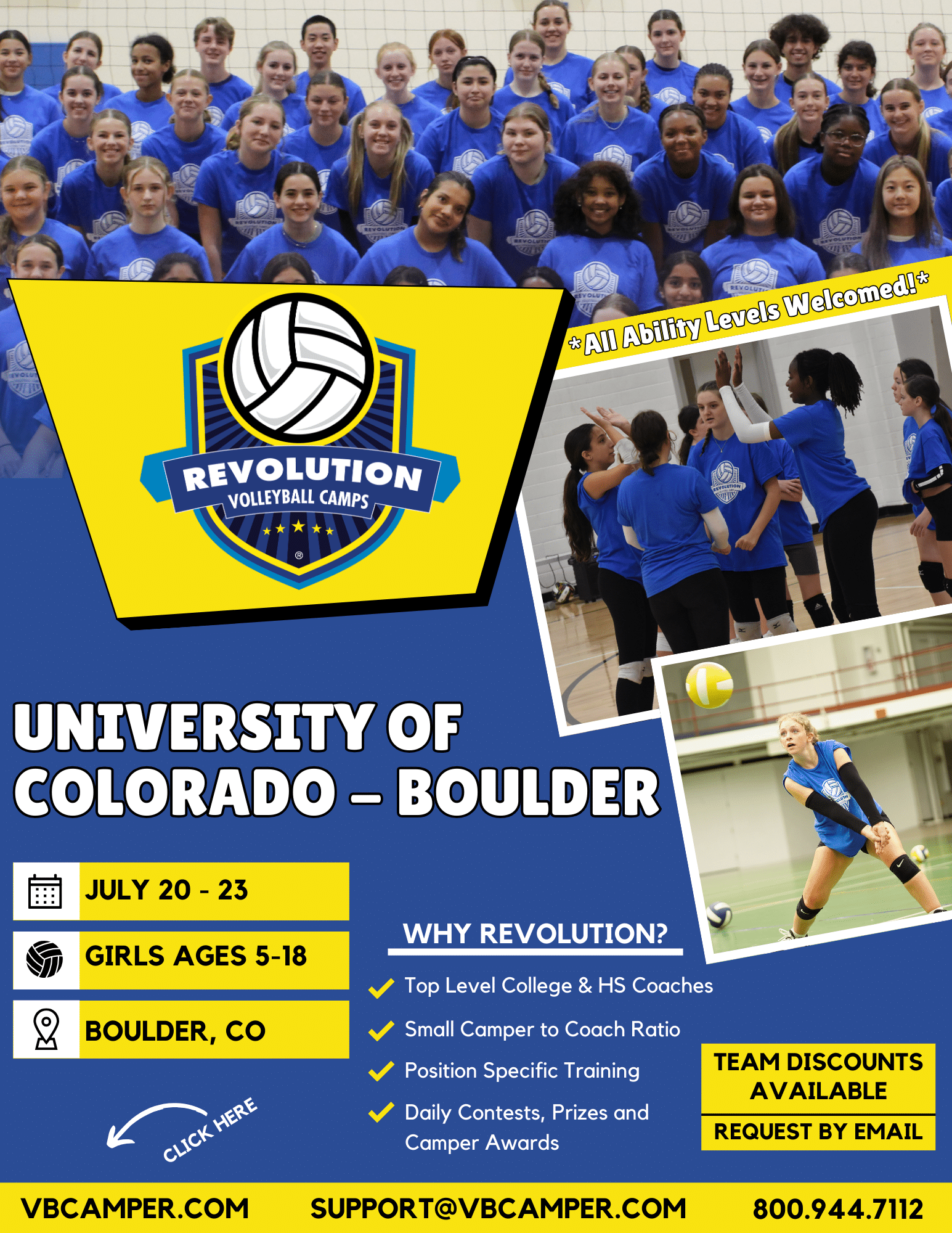 The University of Colorado Coulder Recreation Center is a 30,000 square foot facility with six Volleyball courts and a variety of athletic facilities used for Intramural sports, fitness, and recreation. We’re excited to host the Revolution Volleyball Camps at University of Colorado Boulder. Join us and have fun while improving your volleyball skills this summer!