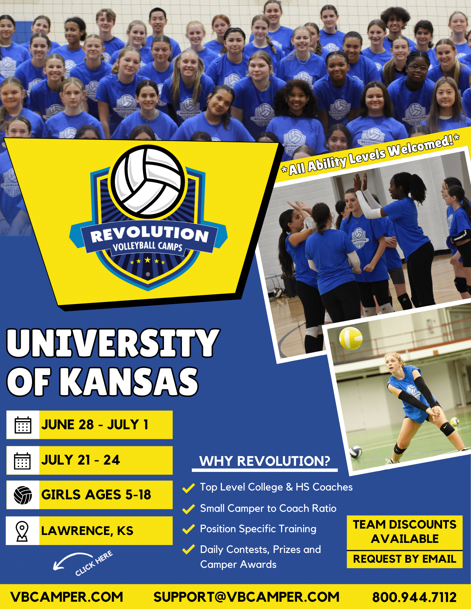 The Ambler Student Recreation Center is a 98,000 square foot facility on the beautiful University of Kansas campus that features volleyball, basketball, and racquetball courts, weight rooms, a rock climbing wall, and more. We’re excited to host the Revolution Volleyball Camps at University of Kansas. Join us and improve your volleyball skills this summer!